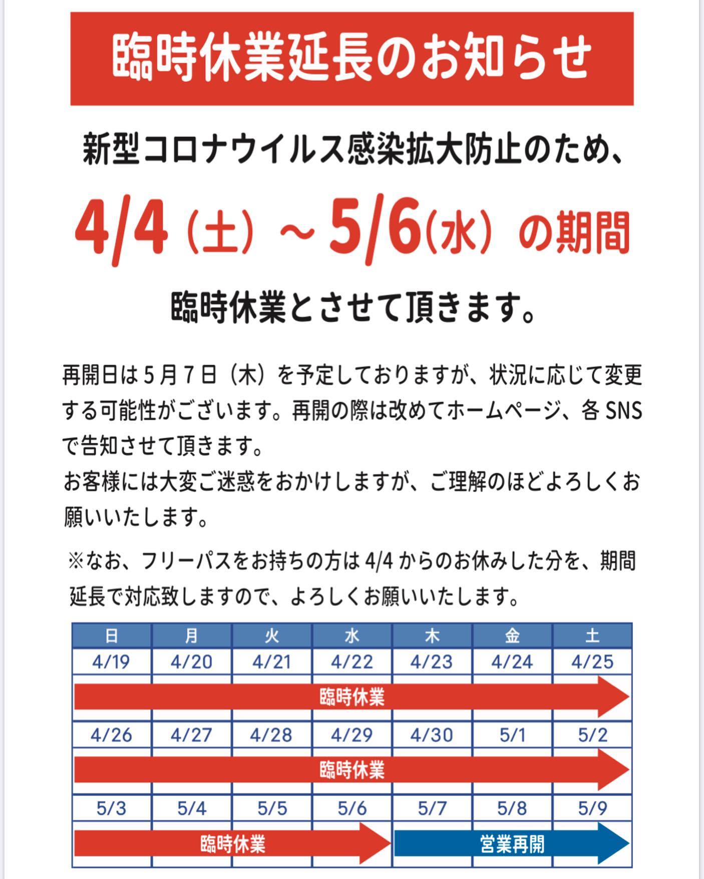 全国への緊急事態宣言を受けて臨時休業措置を5/6まで延長致します。再開日は状況を見て判断したいと思います。
