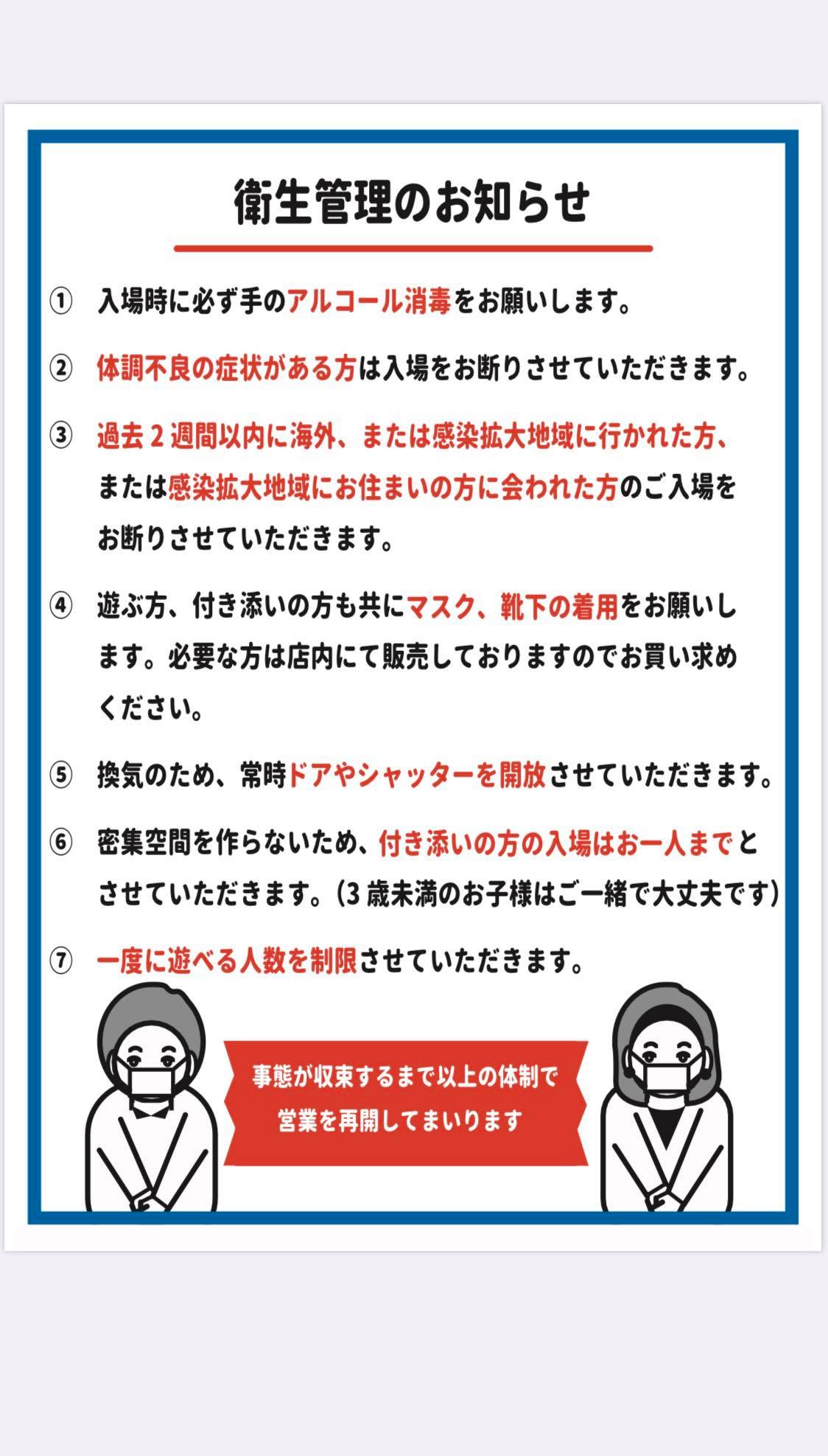 3.遊ぶ方、付き添いの方も共にマスク、靴下の着用をお願いします。お持ちでない方は店内にて販売しておりますので是非お買い求めください。