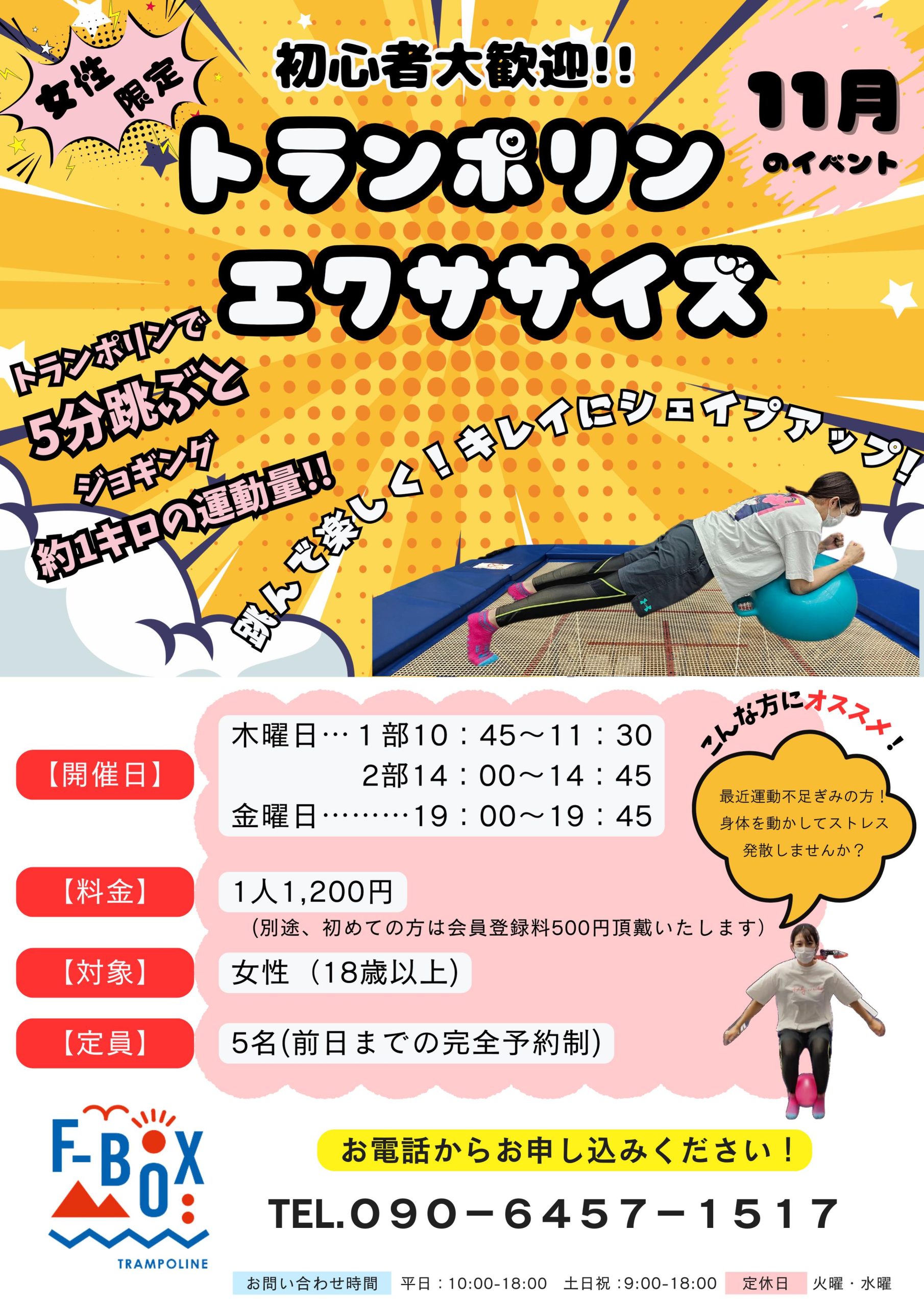 下記の日程で女性限定トランポリンエクサイサイズを実施いたします!